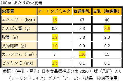 ※アーモンドミルクの数値は製品によって異なります