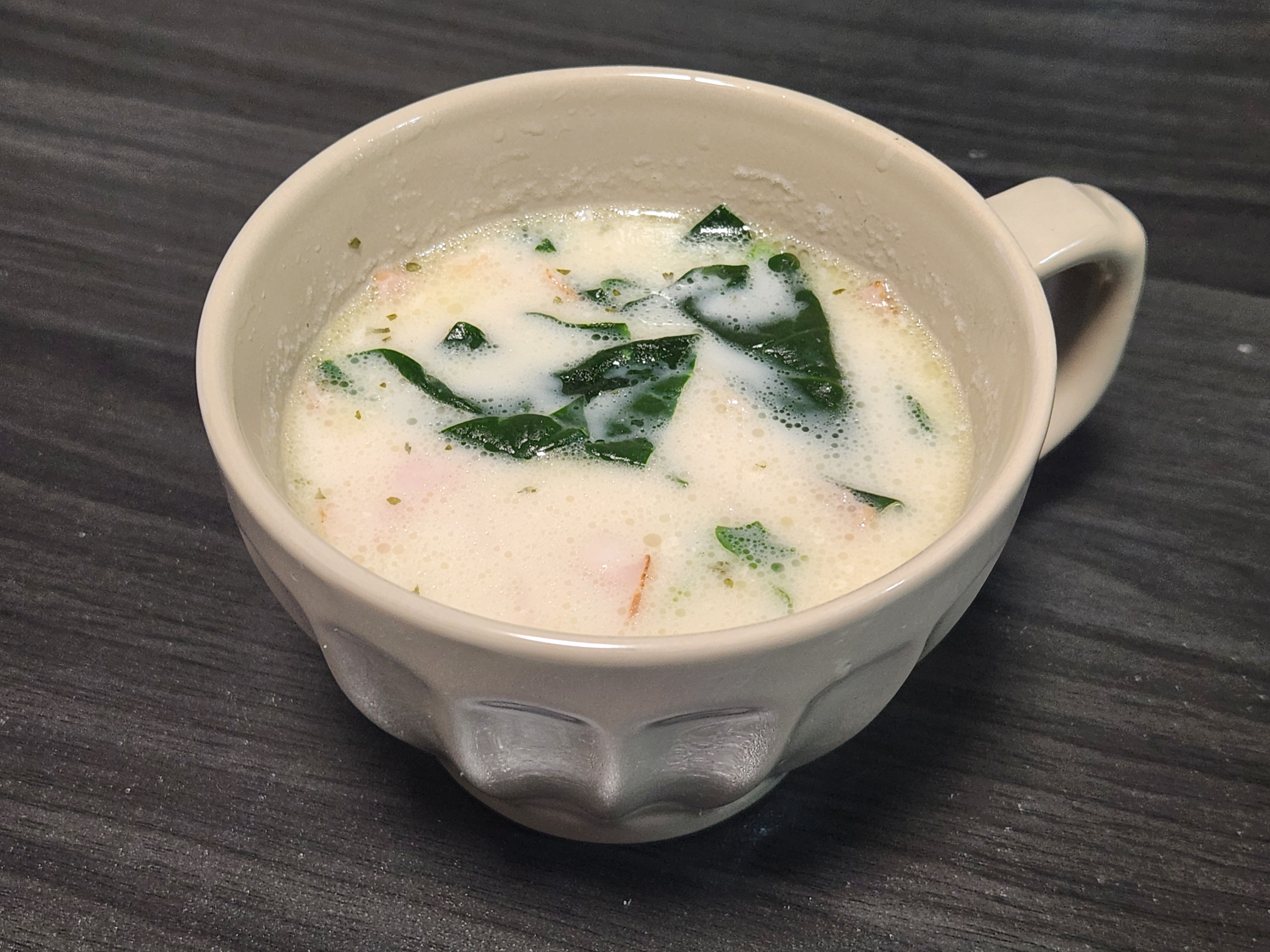 3. 玉ねぎが透き通ったらほうれん草とアーモンドミルク、コンソメを加えます。