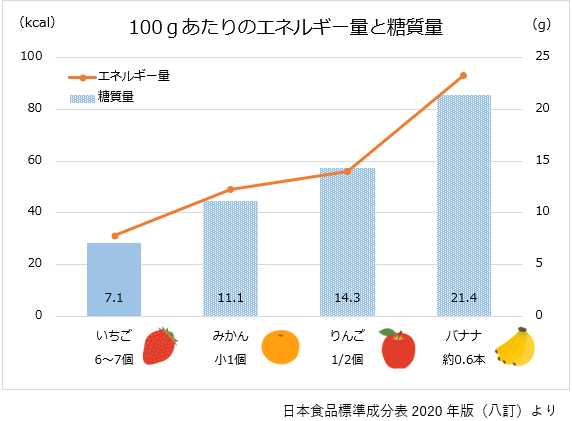 100gあたりで比較するとみかんやりんごよりも少なく、バナナの1/3のエネルギー量になります。さらに糖質量も他の果物と比べて少ないため、糖質を控えたい方にも取り入れやすい果物です。