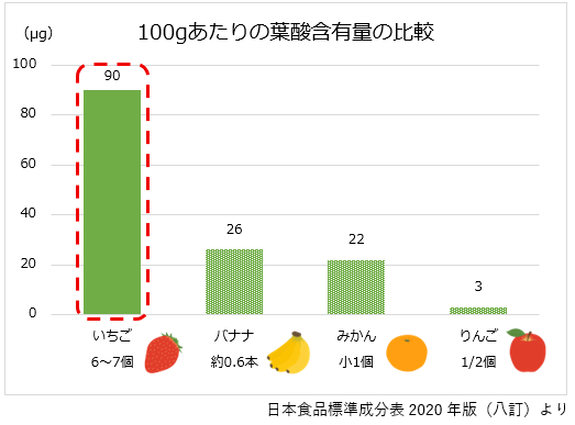 いちごには100gあたり約90µgの葉酸が含まれ、果物の中では比較的多く含まれるため葉酸を手軽に摂取できる果物の一つです。