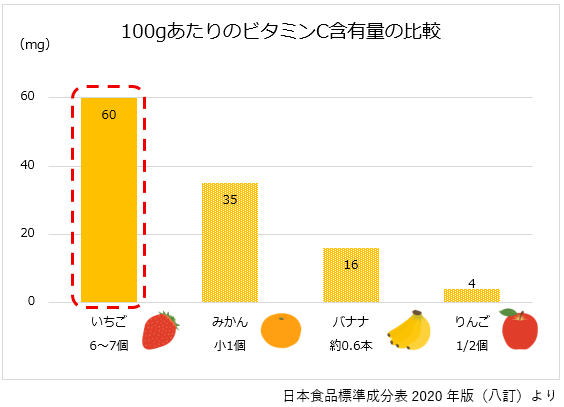 いちごの最大の特徴は、ビタミンCが非常に豊富なことです。100g(約5~6粒)で1日に必要なビタミンC100mgの約半分以上を摂取できます。